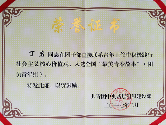 丁岩同学入选“全国最美青春故事”