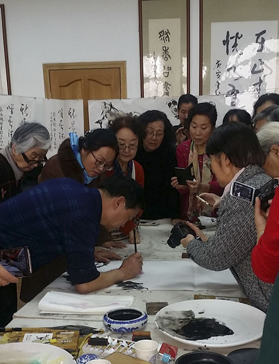 当日上午,刘恩军作了书画艺术专题讲座,从绘画用笔技巧、颜料和墨调配、绘画落笔布局等方面讲解了自己对书画艺术的理解。