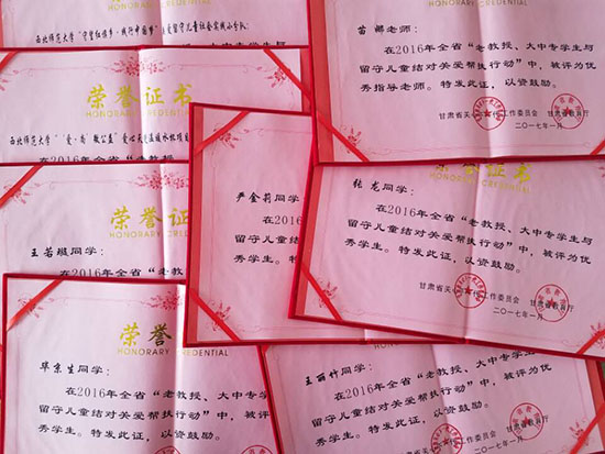 近日,省关工委、省教育厅公布了“大中专学生与留守儿童结对关爱帮扶行动”先进集体和先进个人表彰结果,永利官网教育学院团委书记康金旭老师,党委学生工作部苗娜老师获“优秀指导教师”称号;毕京生、王丽竹、王若璇、严金莉、张龙等5名同学获“优秀学生”称号。 团委“‘爱·尚’微公益”爱心天使温暖水杯项目实践团队、马克思主义学院“守望红旗乡·践行中国梦”关爱留守儿童社会实践小分队获“优秀实践团队”称号。