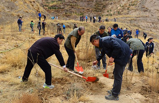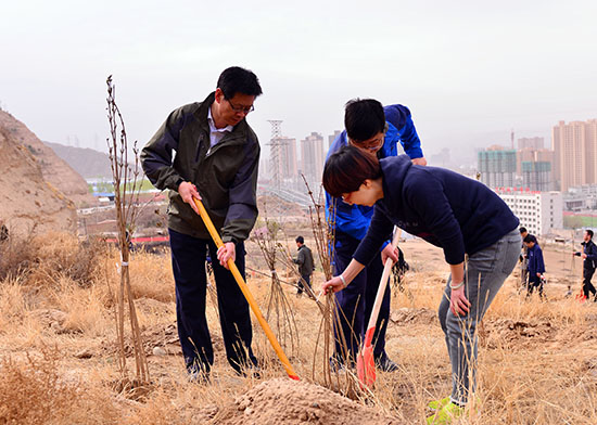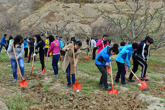 植树现场一派热火朝天的劳动景象,全体机关干部热情高涨,干劲十足,纷纷挥锹铲土、扶苗填坑、平土浇水。整整一个上午,在大家的共同努力下,500余株丁香树苗生机勃勃地挺立在北山二台地上,含苞欲放的桃树林更是在翻整后的山地上展现出盎然春意。植树期间,学校领导现场讨论研究新校区北山生态景观公园规划设计方案。