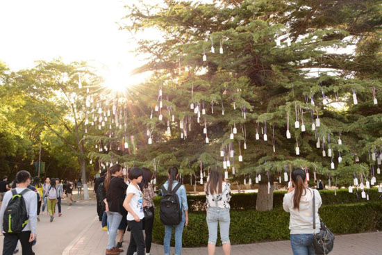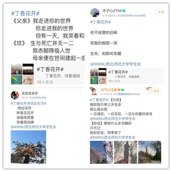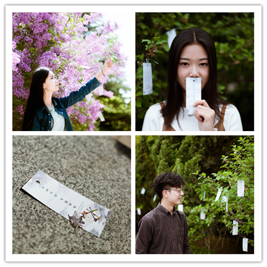 “今天早上在晨读的时候,忽然发现校园里的丁香树上挂满了各式各样的诗词小卡片,在不经意的驻足间,就能感受到浓浓的诗香扑面而来。”商学院2015级候蓉同学对记者说。
