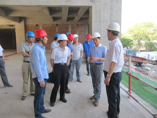 6月26日上午,李建民副校长带领基建处及施工、监理单位负责人,检查新校区中心广场、学生宿舍楼、校本部文科实验实训楼、二附中综合教学楼等项目施工进展情况。