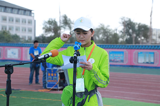 梁晶晶同学带领全体志愿者庄严宣誓:“我志愿成为一名光荣的志愿者。我承诺,尽己所能,不计报酬,帮助他人,服务社会,践行志愿精神,传播先进文化,为建设经济发展、山川秀美、民族团结、社会和谐的幸福美好新甘肃做出更大贡献。”