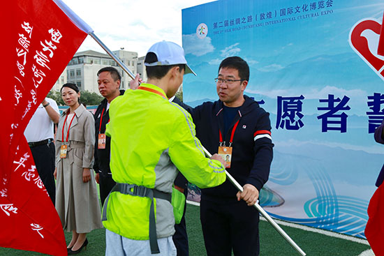 16日上午,文博会志愿者誓师大会在敦煌学院举行。团甘肃省委书记、第二届丝绸之路(敦煌)国际文化博览会执委会志愿服务工作组组长赵立香为志愿者团队授旗并希望他们牢记职责、珍惜荣誉,敬业奉献、热情服务,服从安排、遵守纪律,高效率、高质量地完成好各项服务任务。