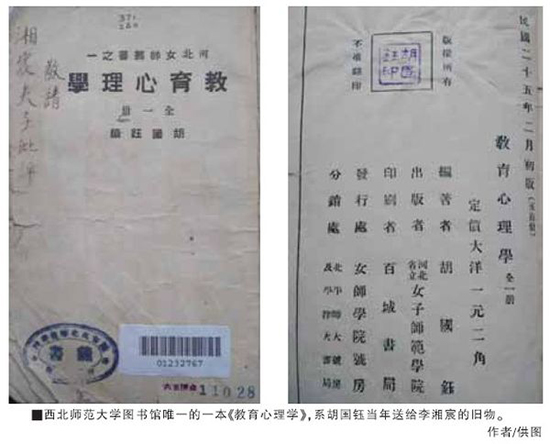 第二,撰写《教育与心理统计》等著作。西方心理学传入我国之后,在20世纪20年代才有我国学者撰写的心理统计方面的著作。胡国钰在读研究生期间,对教育统计有系统的学习,所以,早在30年代左右,他就撰写了《教育与心理统计》一书,但联系商务印书馆出版未果,于是,后来就油印作为西北师范学院上课的讲义。这本书因为没有正式出版,所以后来的学者在整理近现代心理学史的时候,都没有提到,但此书无疑属于心理统计方面较早的著作,对于教育与心理统计方面的推广和教学,具有重要意义。此外,胡国钰曾于1931年至1956年发表多篇教育统计论文,先后分别发表于北京师范大学学报及甘肃师大校刊。从这些文章中,可以看出胡国钰具有深厚的数学功底。在《西北师大逸事》一书中,还记载着他在西北师范学院讲授“教育统计学”的一些故事。对于心理学科而言,统计和数学方法的引入,对于学科走上科学化的进程具有重要意义。那么在心理学作为独立学科的早期,像胡国钰这样既熟悉教育学、心理学,又受过严格的数学训练的人是不多的,很显然,是他们这代人为今天的诸多心理学的方法类学科奠定了基础。