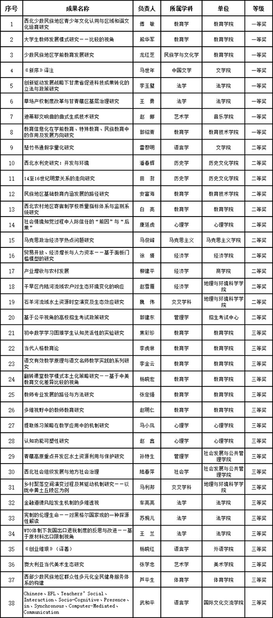 日前,甘肃省教育厅公布了2017年度甘肃省高等学校科研优秀成果奖获奖名单,西北师大共有38项科研成果获奖,其中一等奖8项、二等奖12项、三等奖18项。