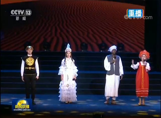 展演现场,来自苏丹、俄罗斯、吉尔吉斯斯坦和哈萨克斯坦的西北师大4名留学生身着本国特色服饰,用汉语普通话饱含深情地朗诵了中国唐代著名诗人王昌龄、王翰、杜甫和王之涣所作的边塞诗。节目以“一带一路”为背景,结合甘肃区位特点,中西合璧,成为晚会的一大亮点。朗诵片段在11月19日《新闻联播》播出。晚会总导演高原和中国传媒大学播音主持艺术学院李洪岩副院长对表演给予高度评价。