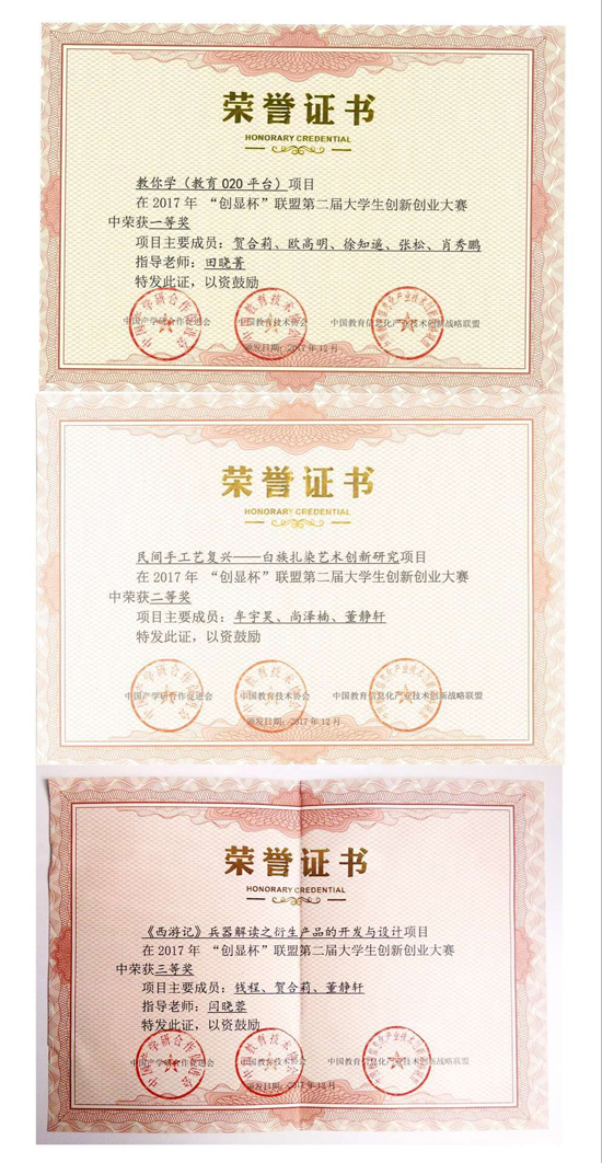 12月2日,全国第二届教育信息化创新创业大赛颁奖典礼在广州举行。西北师大教育技术学院2014级数字媒体艺术专业学生贺合莉团队的“教你学(教育020平台)”项目获得“大学生教育信息化创新创业奖”一等奖,牟宇昊团队的“民间手工艺复兴——白族扎染艺术创新研究”项目获得二等奖,钱程团队的“《西游记》兵器解读之衍生产品的开发与设计”获得三等奖。西北师大获“教育信息化产学研示范奖”。