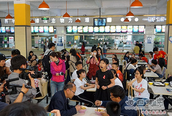 中午12时许,正逢学生用餐高峰期,随着《声律启蒙》的音乐响起,6名学生和舞蹈演员从学生餐饮文化中心的不同方向走来,演唱起《山居秋暝》《鹊桥仙》《明日歌》《墨梅》等中央电视台《经典咏流传》栏目中一首首耳熟能详的古典诗词歌曲。青春活力的表演让现场瞬间一片沸腾,正在食堂用餐的很多同学都被这热闹的气氛所感染,在“快闪”中一起感受中国古典诗词之美。