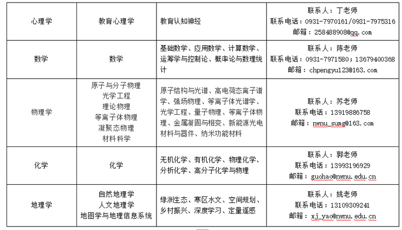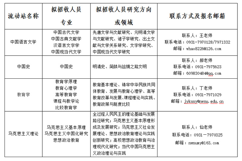 学校人事处联系人:陈老师,联系电话:0931-7971972,邮箱:rscszk@nwnu.edu.cn