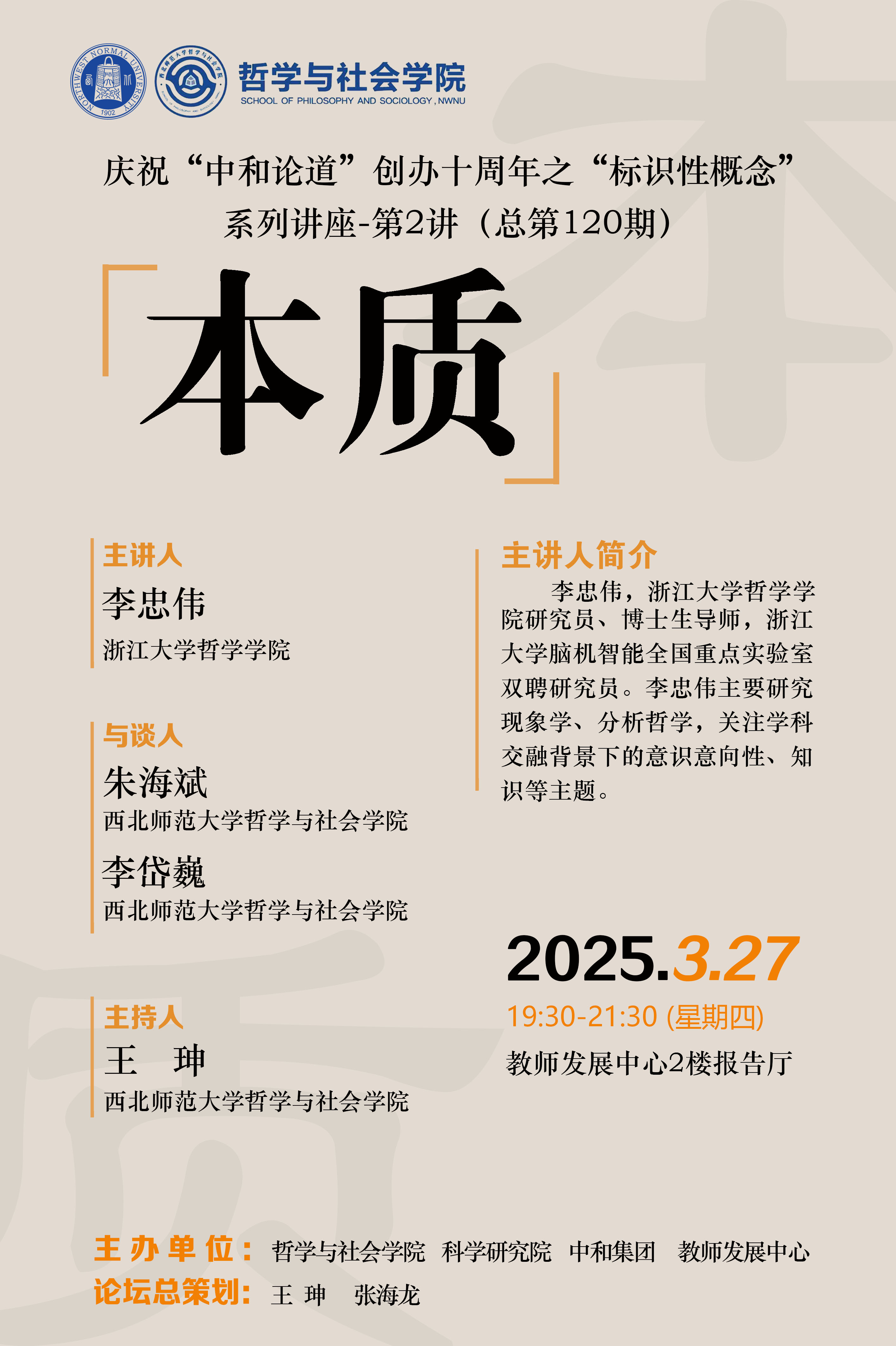 应yl6809永利官网哲学与社会学院邀请,浙江大学哲学学院李忠伟研究员将来永利官网作学术报告,该报告是哲学与社会学院庆祝“中和论道”创办十周年之“标识性概念系列报告之一。具体事宜公告如下: