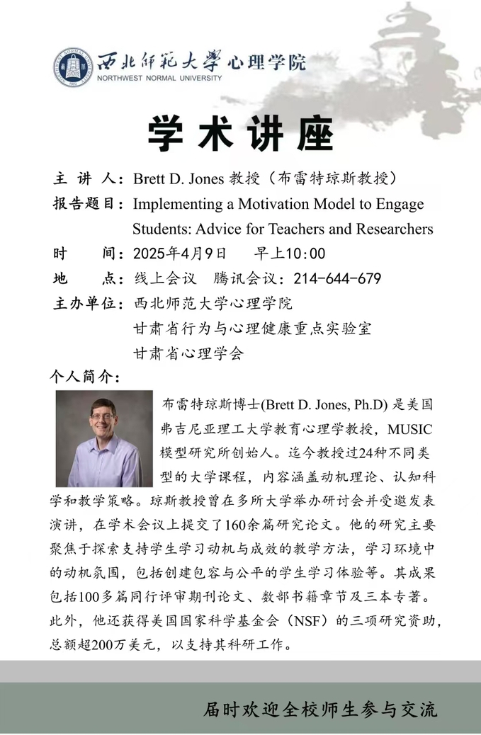 应yl6809永利官网心理学院邀请,美国弗吉尼亚理工大学教育学院Brett D.Jones教授将在线为永利官网师生作学术报告。
