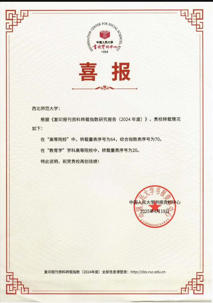 近日,西北师大收到中国人民大学书报资料中心发来的喜报,该中心于近日发布的《复印报刊资料转载指数研究报告(2024年度)》显示,西北师大在高等院校排名中,转载量位列第64名,综合指数位列第70名;在教育学学科高等院校排名中,转载量位列第20名。