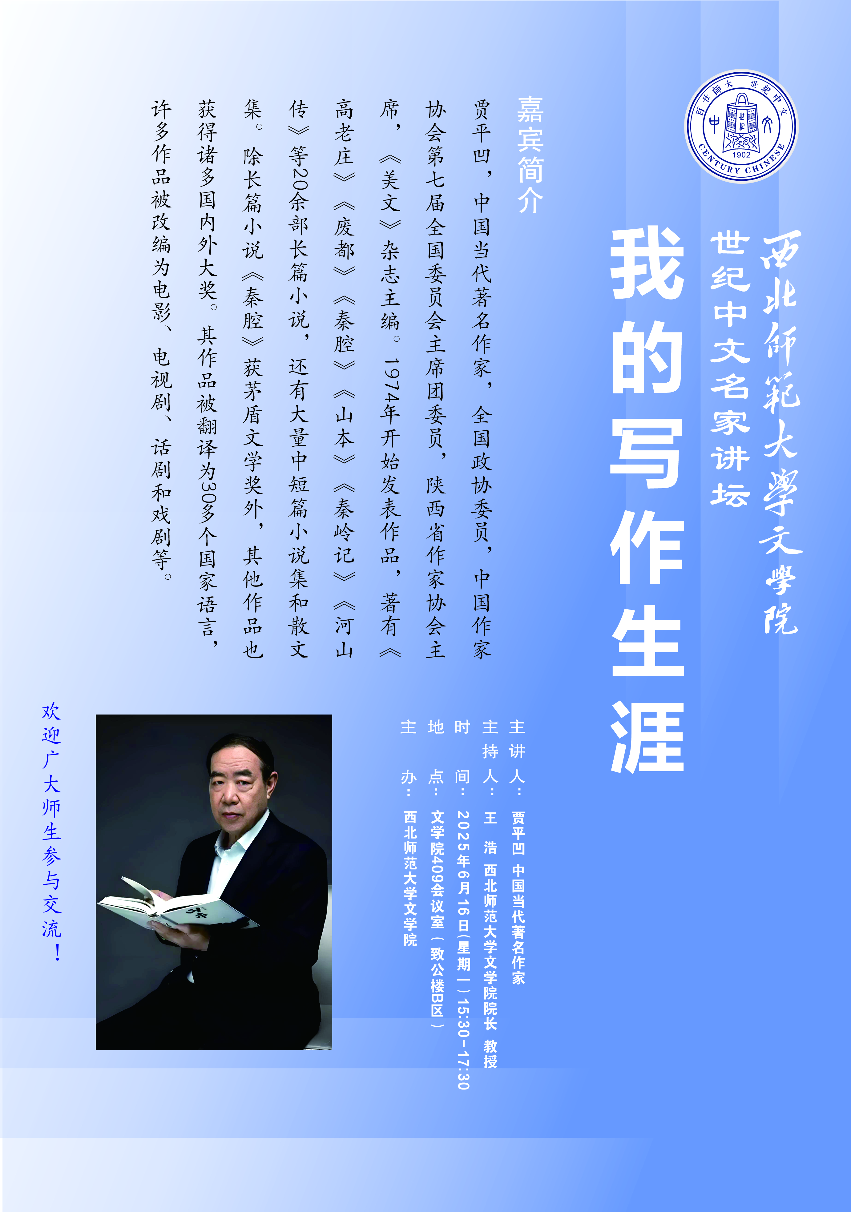 应yl6809永利官网文学院邀请,陕西省作家协会贾平凹主席将为永利官网师生作学术报告。具体事宜公告如下: