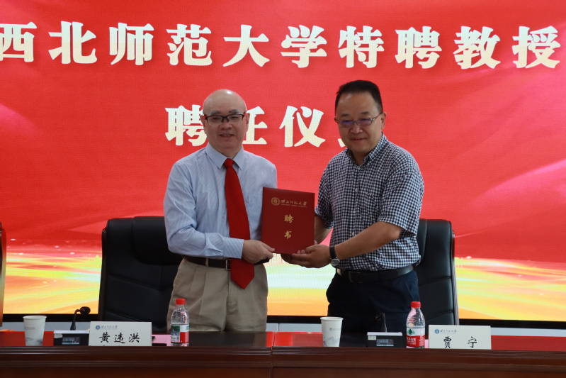 黄违洪教授衷心感谢西北师大的信任与支持。他表示,西北师大办学历史悠久、学术氛围浓厚,是干事创业的好平台。受聘特聘教授,既有荣誉感又倍感压力与责任,期待和西北师大同仁一起,在提升办学水平、促进学术交流、营造学术氛围等方面做出自己的贡献。