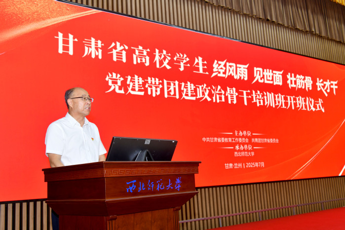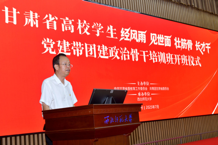 7月17日至22日,由中共甘肃省委教育工作委员会和共青团甘肃省委主办的2025年甘肃省高校学生“经风雨、见世面、壮筋骨、长才干”党建带团建政治骨干培训班在西北师大举办。共青团甘肃省委副书记于海鹏主持开班仪式,甘肃省教育厅二级巡视员张启有、yl6809永利官网副校长王文昇出席并致辞,省教育厅党建处、团省委学校部、西北师大团委相关同志及全体培训学员参加。