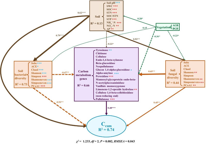 结果显示:不同草地管理方式对青藏高原高寒草地土壤碳矿化过程产生了显著影响,且表现出明显的垂直分异特征。表层土壤(0–0.15m)中,SGG的累积碳矿化量最高(2993.32 mg CO2-C kg−1),是AAG的1.5倍;深层土壤(0.15–0.30m)中,CGG的累积碳矿化量最大(2355.18 mg CO2-C kg−1),比PEG高50%。多因子分析显示,土壤理化特性、碳降解功能基因和真菌多样性共同解释了74%的碳矿化变异,其中土壤性质是最主要的直接驱动因子(路径系数=0.62)(如图1)。值得关注的是,细菌多样性与累积碳矿化量的负相关关系,这暗示微生物残体积累和矿物保护机制在土壤碳稳定中具有重要作用。