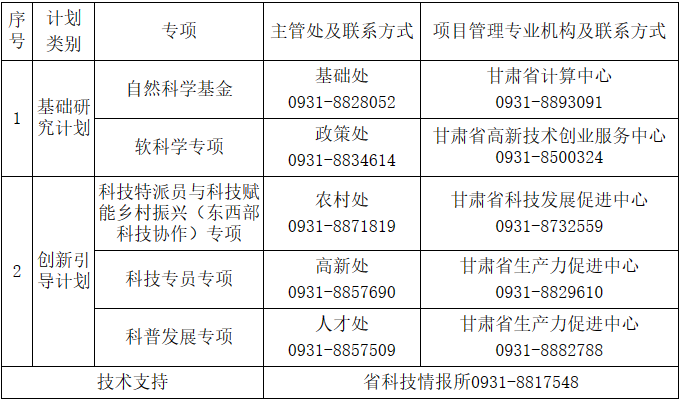 科学技术厅主管处室及项目管理专业机构联系方式: