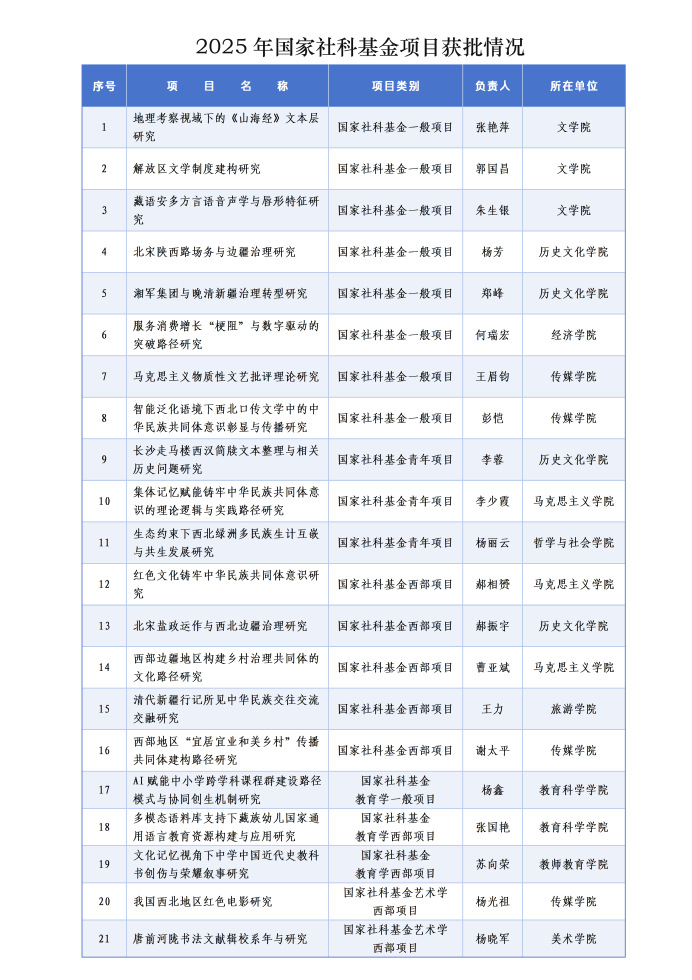 近日,国家社会科学基金年度项目、教育学项目、艺术学项目陆续公布立项结果,西北师大获批国家社科基金各类项目共计21项。其中国家社科基金年度项目16项(一般项目8项、青年项目3项、西部项目5项)、教育学项目3项(一般项目1项、西部项目2项)、艺术学项目2项(均为西部项目)。