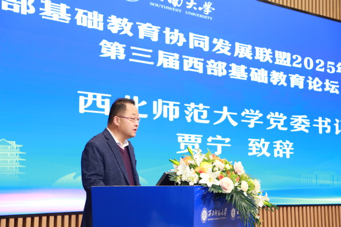 贾宁在致辞中回顾了西北师大扎根西部、坚守师范教育的办学传统。他表示,师范教育是教育工作的“母机”,是提升教育质量的动力源泉。推动基础教育高质量发展,构建中国特色教师教育体系,亟需师范大学和各级中小学携手并肩、紧密合作,共同建立“教育共同体”,通过资源共享和优势互补,大力推动教育理论与教学实践的有机结合,实现教育智慧与实践经验的深度交融。他希望通过本次论坛能够凝聚智慧、形成共识,为促进西部基础教育高质量发展贡献思路与方案。