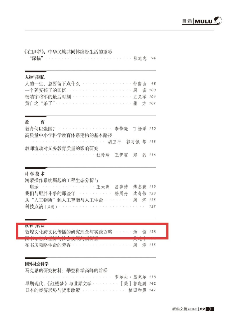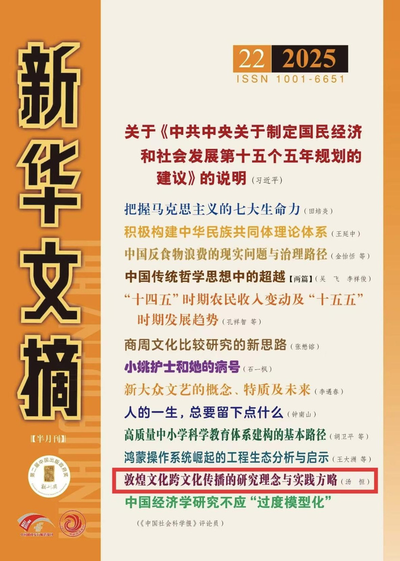 近日,西北师大传媒学院汤恒教授撰写的文章《敦煌文化跨文化传播的研究理念与实践方略》(原载《现代传播》2025年第8期) 被《新华文摘》2025年第22期全文转载。
