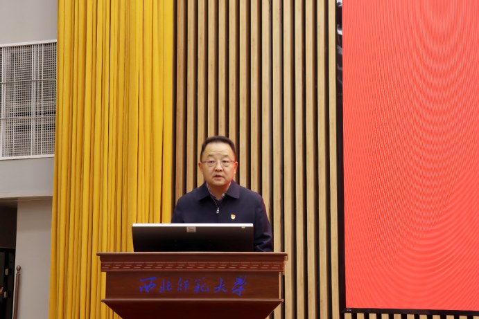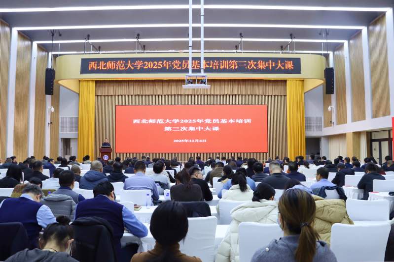 12月4日下午,西北师大举行2025年党员基本培训第三次集中大课,组织全校师生党员集中观看学习中央党校(国家行政学院)副校长(副院长)谢春涛教授主讲的专题辅导报告。党委书记贾宁主持并讲话。校长、党委副书记王占仁,校领导焦爱胜、张明军、王文昇、阎岩,党委常委、党委组织部部长周琳辉出席。全校6000余名师生党员参加。