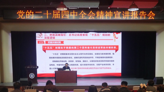 于海鹏以“深学笃行党的二十届四中全会精神,勇担‘十五五’现代化新使命”为题,围绕全会召开的历史背景、重大意义与战略部署,进行了系统阐释和深入解读,回顾总结了“十四五”时期我国经济社会发展取得的历史性成就,阐述了“十五五”规划在基本实现社会主义现代化进程中的关键作用。他指出,学习贯彻党的二十届四中全会精神,是当前和今后一个时期的重大政治任务。我们要坚持不懈深入学习贯彻习近平新时代中国特色社会主义思想,深刻领会学习全会对“十五五”时期发展指导思想、基本原则、主要目标和重点任务的战略部署,坚定信心,奋勇前行,以更加昂扬的姿态迈向“十五五”新征程,为全面建设社会主义现代化国家、实现中华民族伟大复兴贡献智慧和力量。