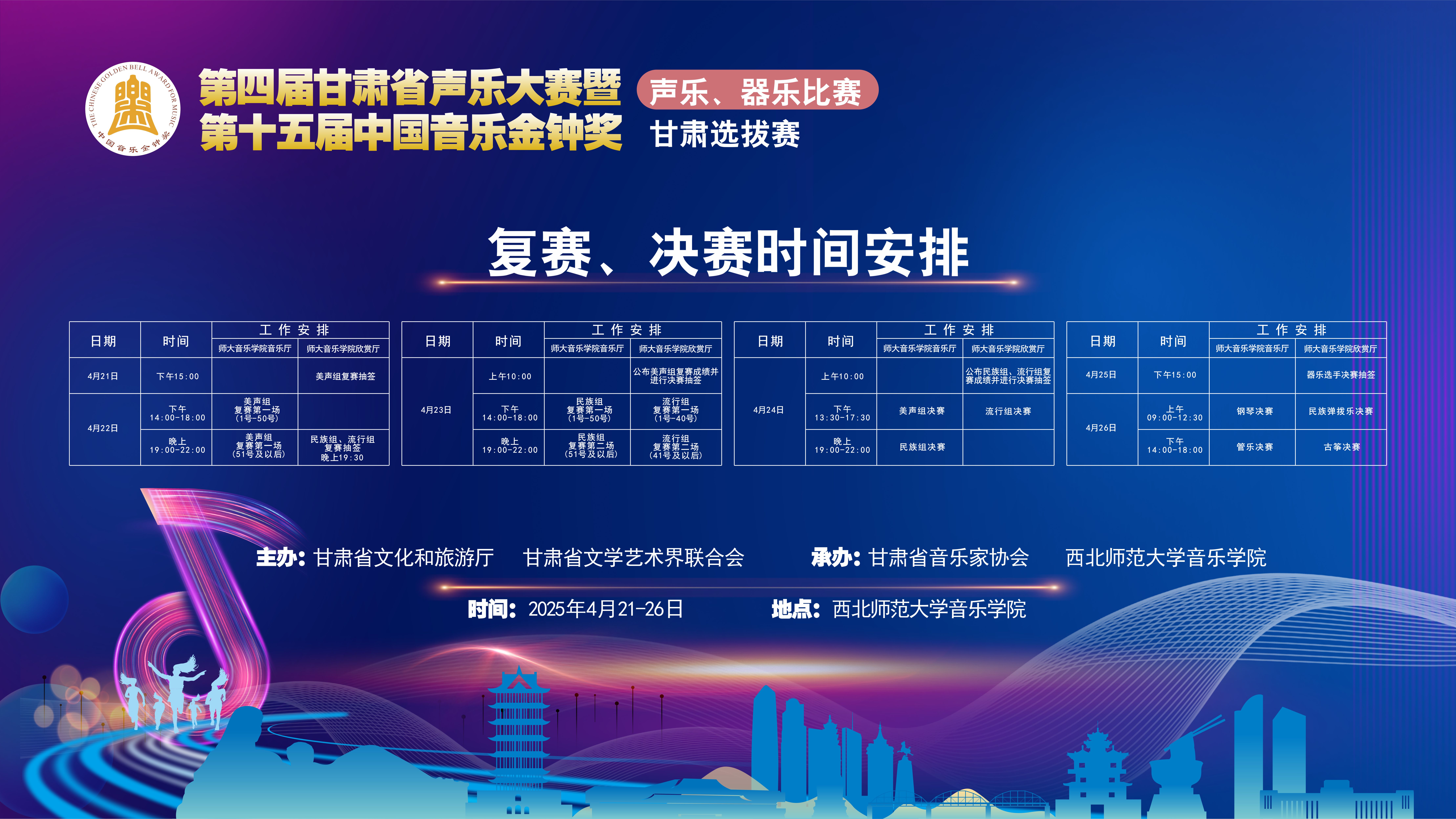 第四届甘肃声乐大赛暨第十五届中国音乐金钟奖声乐、器乐甘肃选拔赛时间:2025年4月21日—26日地点:yl6809永利官网云亭校区音乐厅 -